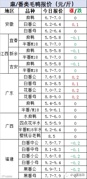 明日麻鸭局部报涨0.1元/羽,整体仍处于低谷。明日半番鸭苗报价稳定。