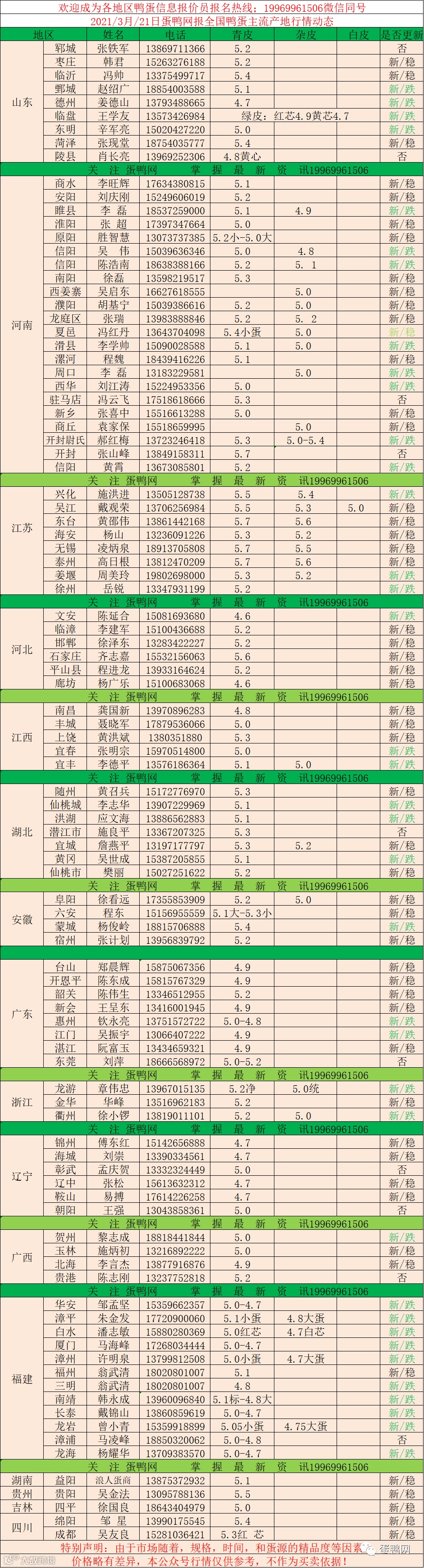2021年3月21日鲜鸭蛋价格:初产至大蛋4.7(鸭蛋价格仅供参考)。