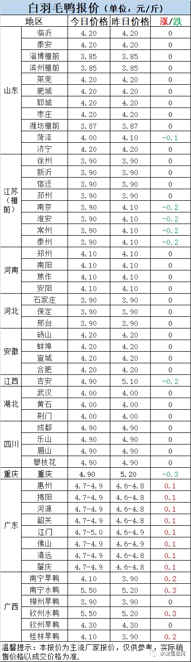 1:今晚北方分割鸭区域报价稳定为主,局部下滑。当前北方冷藏以回收合同为主,对市场鸭收购积极性一般。北方鸭价整体处于温吞状态,冷藏库存、成本双重压力下经营压力巨大。