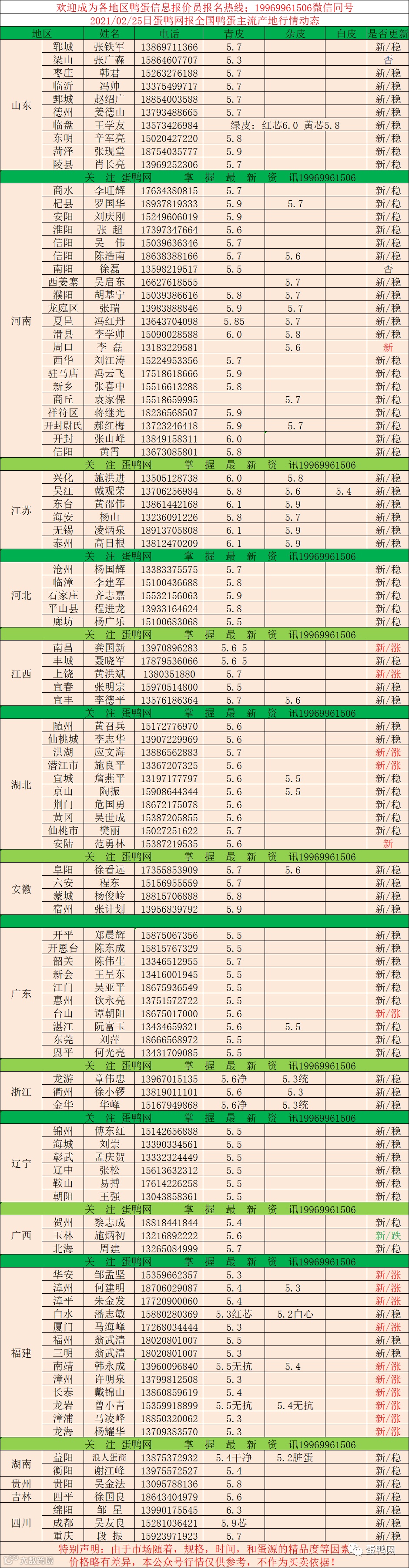 2021年2月25日鲜鸭蛋价格:初产至10个头4.8元, 10个头至9个头5.1。9个至8个头5.3元, 8个头至7.5个头5.4元。7.5个头以上5.5元。(鸭蛋价格仅供参考)。