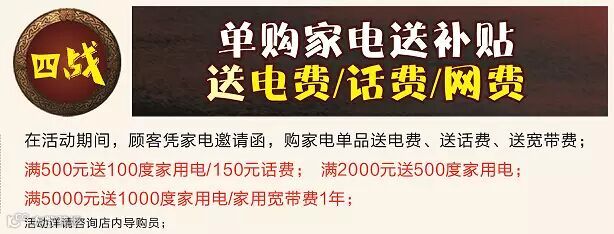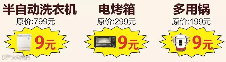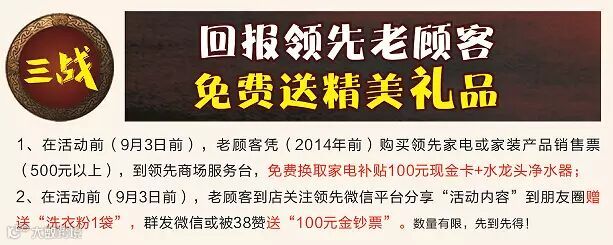 9月3-6日去领先“战便宜”,单购家电送电费、网费、话费;套购家电砸金蛋最高送沁园净水器;单购家电送秒杀32"液晶电视9元、两门冰箱9元、半自动洗衣机9元、电烤箱9元、多用锅9元,凭家电邀请函到领先家居体验馆抢购9元起家电;