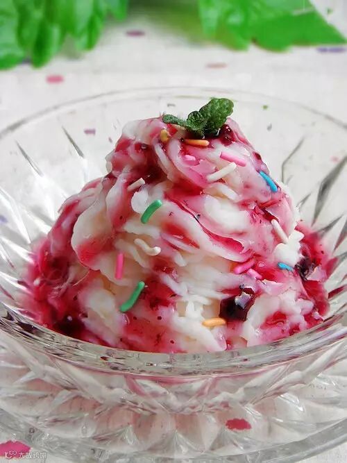 4.挤成冰激凌的样子,淋上适量大喜大蓝莓酱,撒上少许糖针即可。