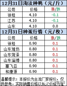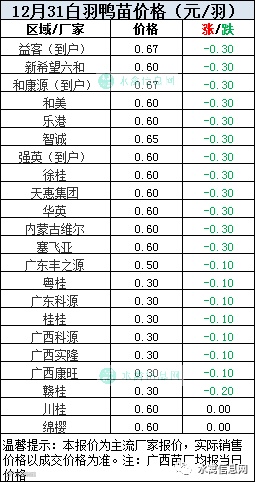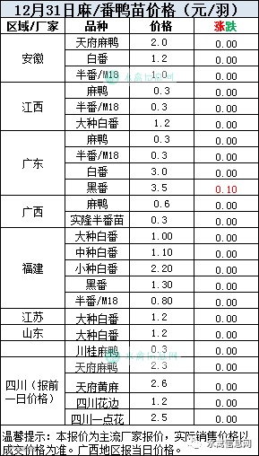 一、2020年12月31日白羽鸭苗报价;