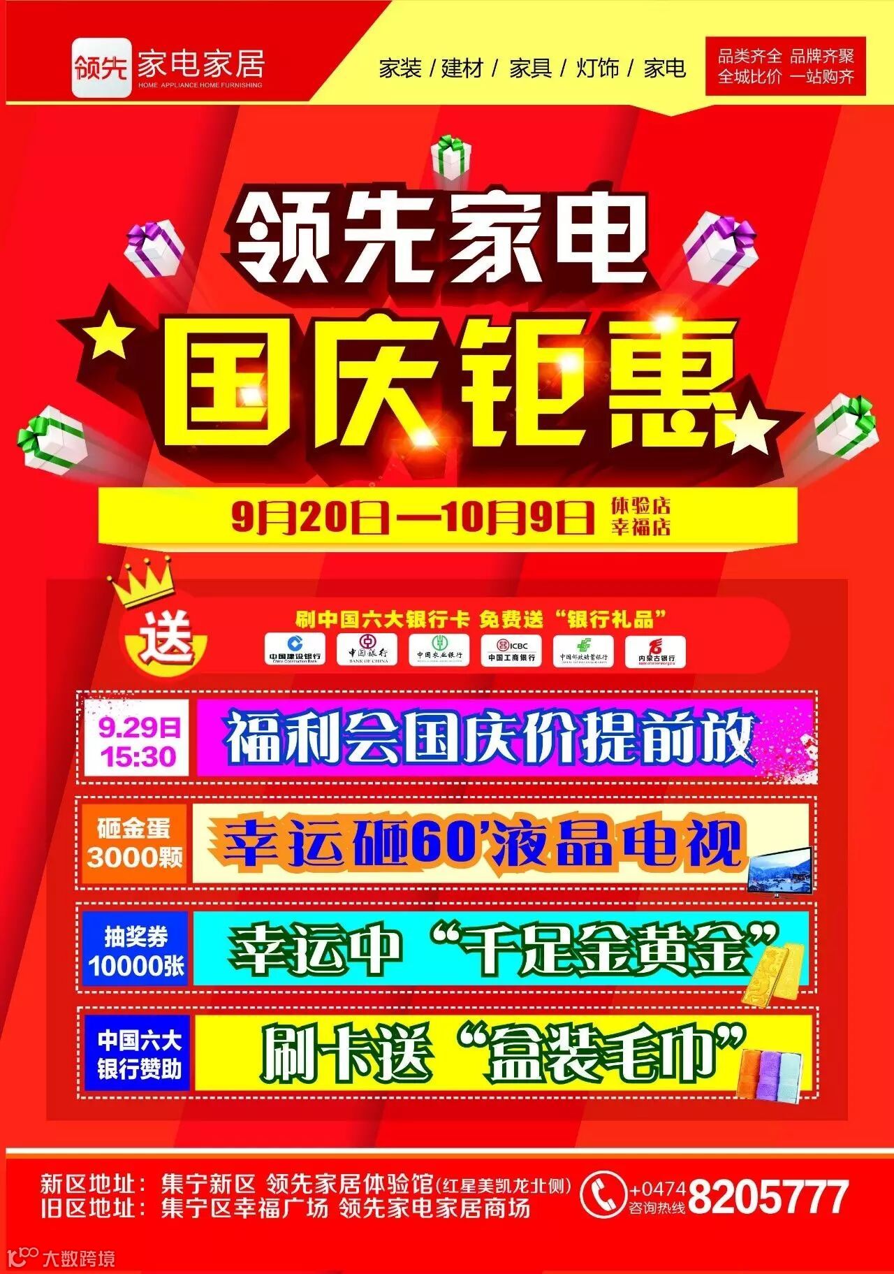套购家电消费满5000元,砸金蛋1颗;以此类推,每户客户最高砸5颗,幸运中60吋液晶电视,100%中奖。