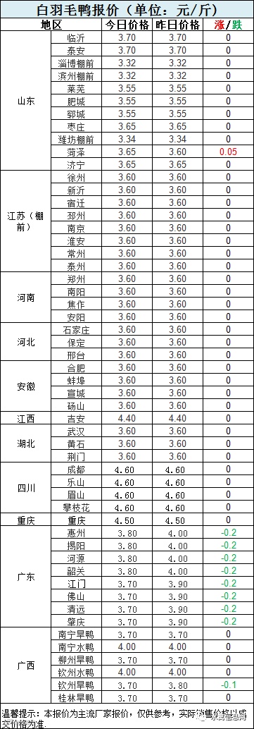 明日白鸭苗报价,整体稳定,川渝下滑0.4元/羽。