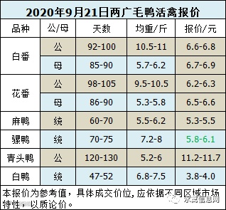 2020年9月21日晚至9月22日毛鸭报价