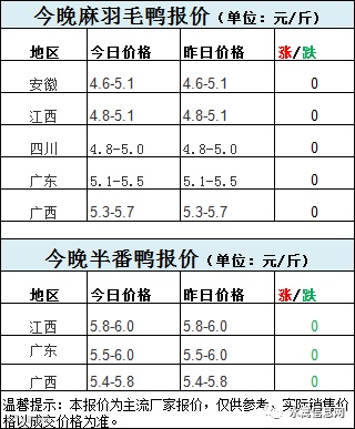 临近八月十五活禽出栏较为集中,今晚麻鸭报价整体稳定,但局部呈弱势。半番鸭类价格弱势,局部继续下调。
