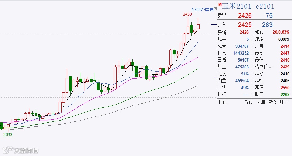 今年以来,玉米期货价格涨幅超过28%。9月14日,国内玉米期货主力合约2101更是创下6年以来最高值2450元/吨。