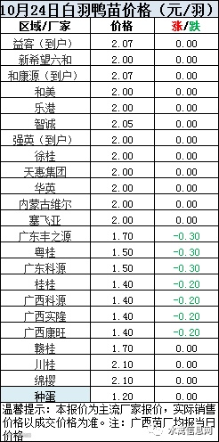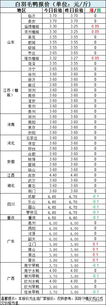 明日白鸭苗报价,两广继续下滑0.2-0.3元/羽,其他区域报价稳定。