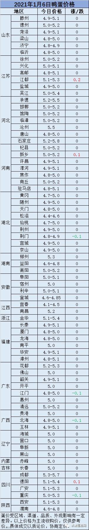 【鸭蛋价格】2021年1月6日鸭蛋报价:高位调整,涨跌不一。
