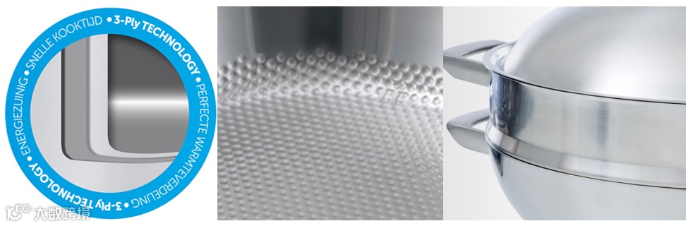 这种独特的三层钢技术将铝板夹在两层高质量的不锈钢之间。这种材料确保了热量能均匀的传递,这样就能更均匀,更快速地烹饪食物。