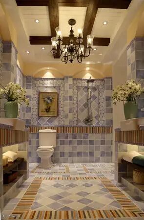 蓝、黄、棕、白的仿古砖,随意的深浅排列组合,在整个房间蔓延,制造出“淡妆浓抹总相宜”的效果,配上欧式的洗漱池和魔镜般的镜子,让你放佛置身在一个魔幻的世界。