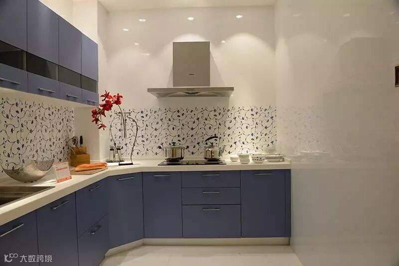 典型的地中海风格设计,厨房使用的是蓝白相间的仿古砖进行铺贴,搭配设计简约的橱柜,再加上灯光设计的巧妙运用,富有流线及梦幻色彩的线条等软装特点来表述其浪漫情怀,恰到好处的设计,让这美味厨房不仅飘出香味,更能溢出色彩。