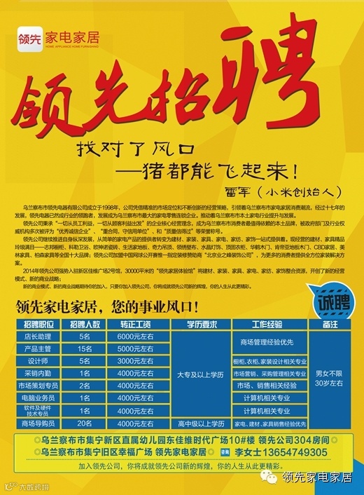 【领先家电家居】诚聘英才  您的事业风口! 领先家电家居