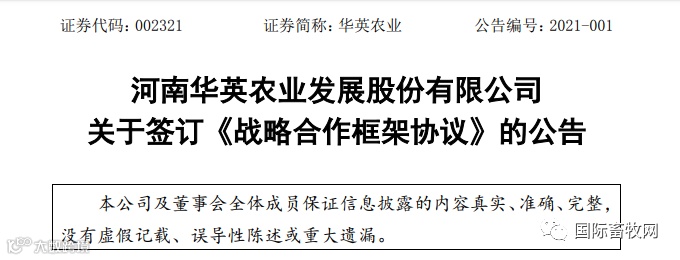 1月14日,华英农业发布公告,公司与上海新增鼎资产管理有限公司签订《战略合作框架协议》。