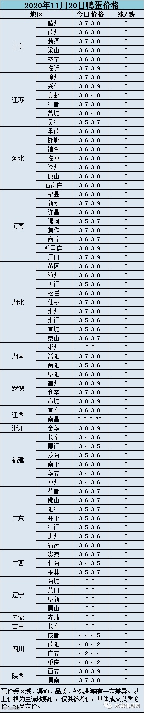 2020年11月20日淘汰蛋鸭价格参考值:活禽7.0-7.5元/斤、屠宰5.5-6.0元/斤。受肉鸭活禽价格下跌影响叠加淘鸭增多种鸭淘汰乱市,淘汰蛋鸭持续弱势震荡,走货较慢。