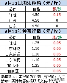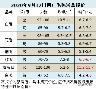 2020年9月12日晚至9月13日毛鸭报价