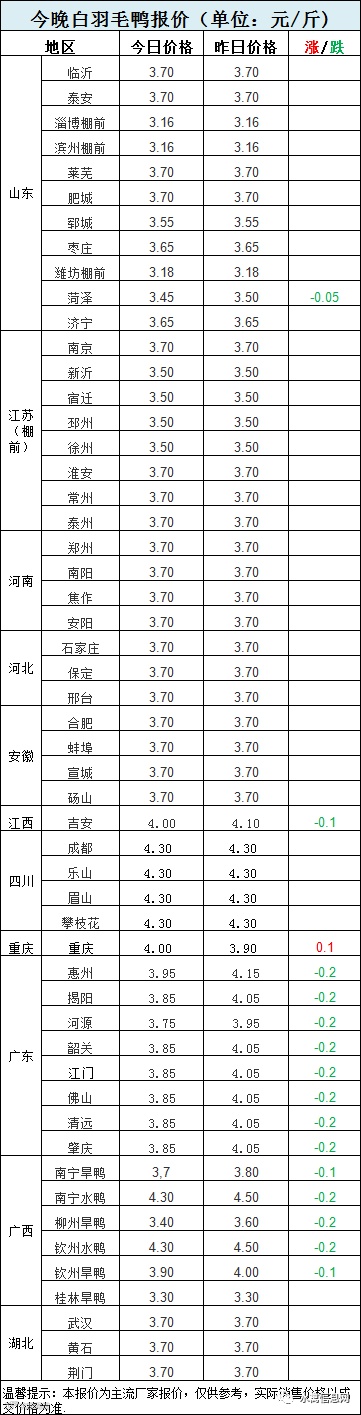 今晚樱桃谷毛鸭报价:北方分割鸭区域,整体报稳调整,山东局部下滑。活禽区域,两广惨跌探底,其他区域稳定。