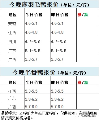 今晚樱桃谷毛鸭报价:分割鸭区域冻品疲软,支撑不足,山东棚前继续下滑,其他区域暂稳。活禽区域,今晚广东报价暂稳,广西大幅追跌。