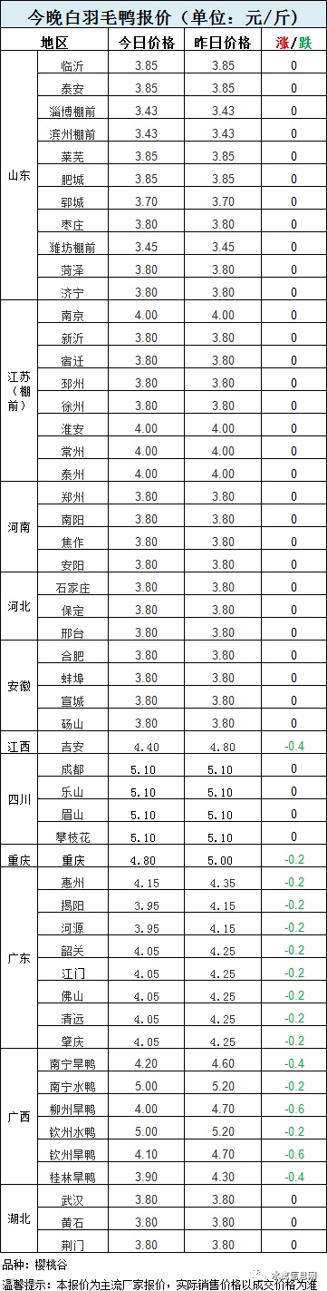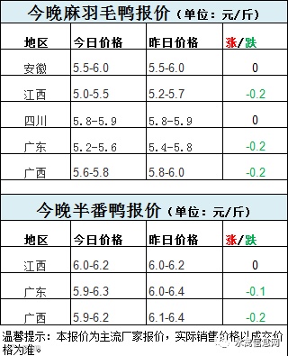 受白鸭大幅跳水影响,今晚麻鸭、番毛鸭报价整体下跌。