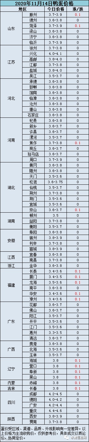 2020年11月14日淘汰蛋鸭价格参考值:活禽7.0-7.5元/斤、屠宰5.8-6.8元/斤。受肉鸭活禽价格下跌影响叠加淘鸭增多种鸭淘汰乱市,淘汰蛋鸭持续弱势震荡,走货较慢。