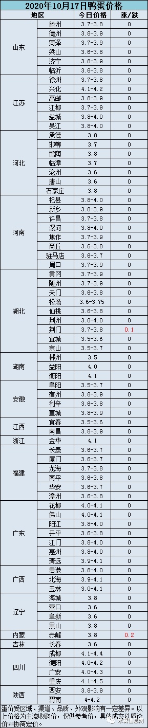 2020年10月17日淘汰蛋鸭价格参考值:5.8元/斤。受肉鸭活禽价格下跌影响叠加淘鸭增多种鸭淘汰乱市,淘汰蛋鸭持续弱势震荡。
