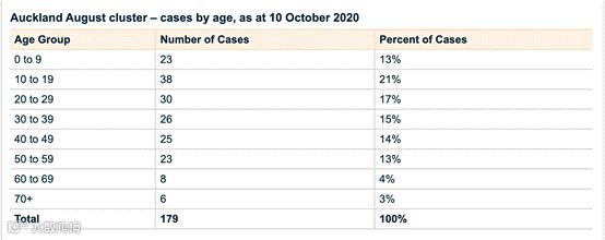 “奥克兰8月集群”统计数据显示,截止当地时间10月10日,该集群已有病例179人,年龄层分布广泛,9岁以下有23人,70岁以上有6人,20到49岁有81人。