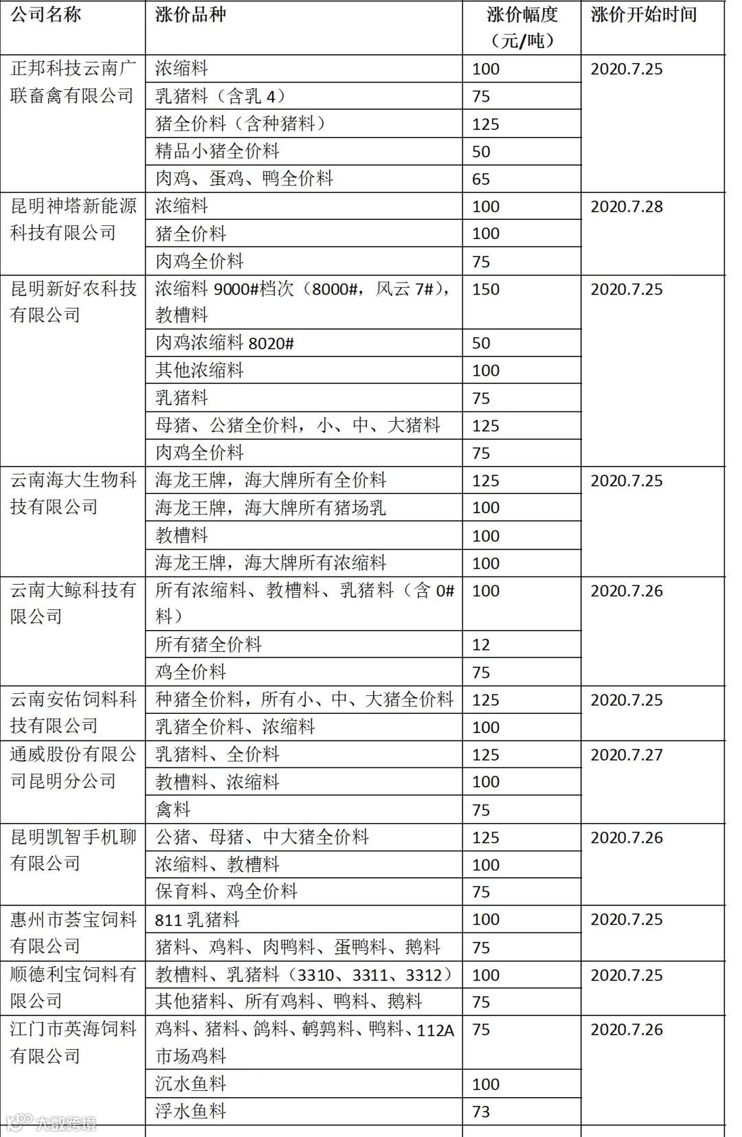 山东是国内玉米深加工消费最大的省份,目前山东潍坊深加工企业玉米收购价格已经超过2420元/吨,比南方销区沿海港口玉米价格2360元/吨还高。受玉米价格影响,不仅玉米深加工企业不断提高收购价格,饲料企业更是在一个月内连续涨价2次,7月初通威、正邦、安佑、九鼎、百宜等饲料企业率先掀起畜禽料涨价潮,多数企业教槽料涨幅100元/吨,其他猪料75元/吨,禽料50元/吨;然而还不到一个月,7月25日起更多的饲料企业拉开月内第二波涨价潮,此次涨价的涉及除预混料以外的全品种,除疯狂的玉米外,豆粕较月初也上涨200-300元/吨,浓缩料已然也加入了涨价的行列。