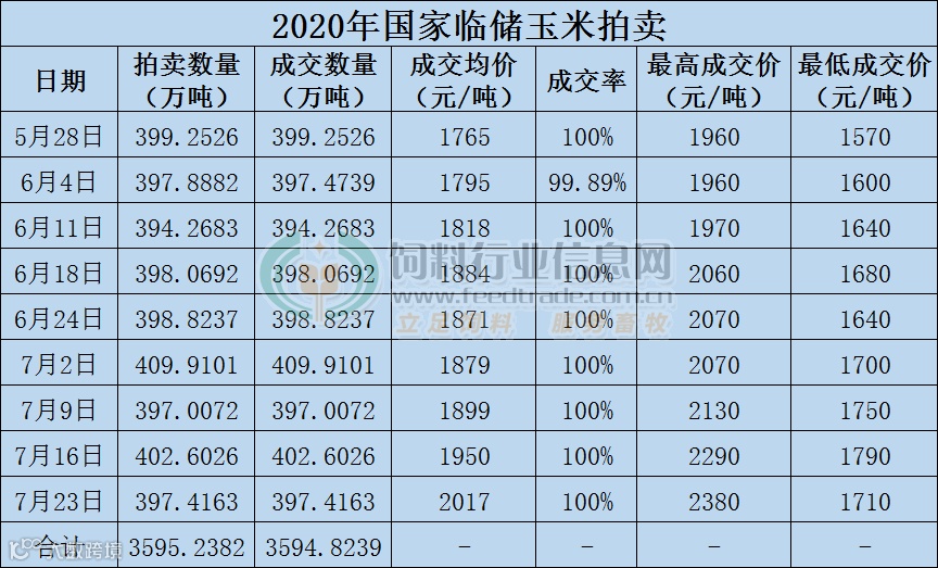 玉米价格像一匹脱缰的野马一路强势上涨,从5月28日到7月23日临储玉米共进行了9次拍卖,成交数量共计约3600万吨,除第二次拍卖外,其余8次均高溢价100%成交。刚刚过去的第9拍结果更是超出预期,成交率100%,平均2017.36元/吨,平均溢价351元/吨,较上周高62元/吨。蒙南地区中央储备粮巴彦淖尔直属库有限公司拍出天价玉米!三个标的共计10794吨一等粮,起报价1780元/吨,最后成交价2380元/吨,溢价高达600元/吨。