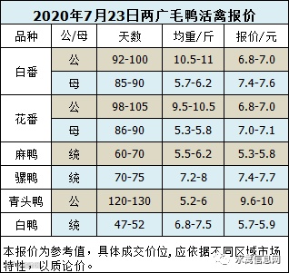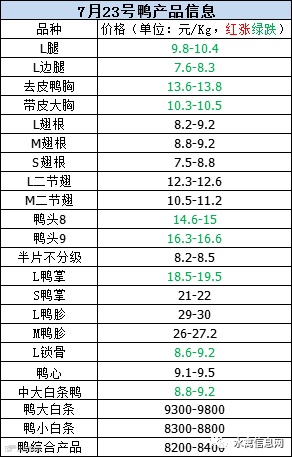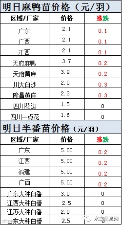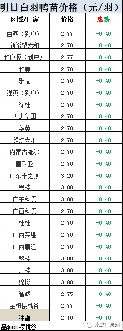 明日7月24号,樱桃谷鸭苗全线下滑,全国主流大厂报价全线下调0.4元/羽不等。麻鸭/半番鸭苗继续报涨0.1-0.2元/羽不等。【详细报价请查看下方表格】