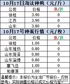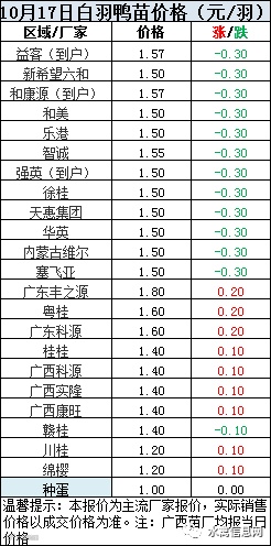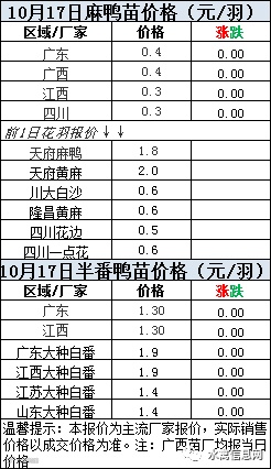一、2020年10月17日白羽鸭苗报价;