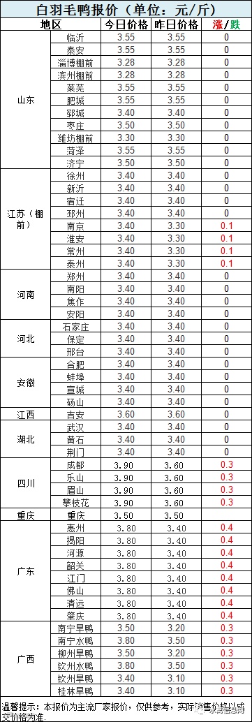 明日白鸭苗报价,北方继续下调0.3元/羽,江西下调0.1元/羽,南方上调0.1-02元/羽不等。北方冷藏养殖端难以接受较高苗价,苗价继续下滑。南方天气转好叠加毛鸭大幅拉升,补栏积极,报价小幅上调。