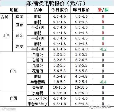 今晚麻鸭/半番鸭报价涨跌不一。白鸭底部拉升,带动麻鸭局部上调。半番持续弱势。
