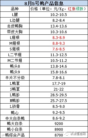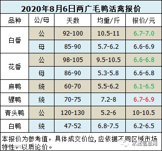 2020年8月6日晚至7日毛鸭报价