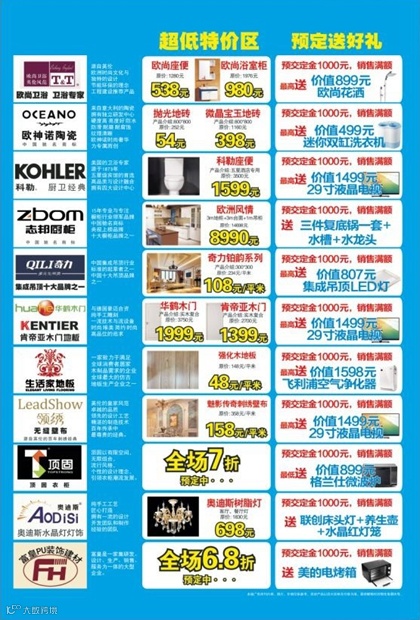顾客在5月2日预订家装产品,顾客转销满消费金额 送坐便、送花洒、送微波炉、送电视等。
