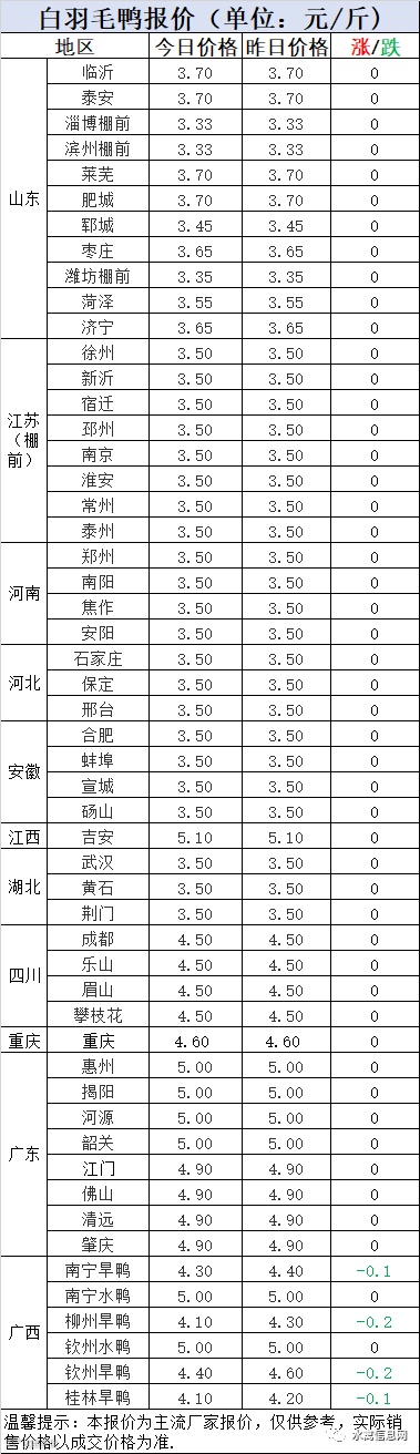 2:南方活禽区域,价格连续攀升后,开启震荡回调。今晚报价整体稳定,广西含旱鸭继续下滑。