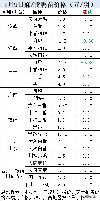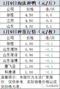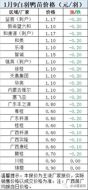 一、2021年1月9日白羽鸭苗报价;