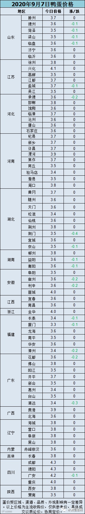 【鸭蛋价格】2020年9月7日鸭蛋报价,弱势持续下滑。