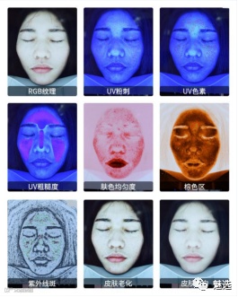 『魅选』皮肤检测仪是采用现代科学AI智能图像检测技术打造,通过白光、UV365、正偏光、负偏光、UV495五种光谱技术及2800万像素高清摄像,利用人工智能技术,快速、准确找出人脸T区、脸颊、O区,抛弃了手动调节的繁琐,诊断皮肤十大问题,针对皮肤毛孔、粉刺、皱纹、色素、角质以及皮肤水分、油分、弹性、肤色、敏感度方面对人脸识别进行精准的分析,检测仪内置庞大的脸部数据库,可与同年龄、同肤质、同地区人做对比。全方位把皮肤的状况精确的显示出来,进而让皮肤科医生针对性地设计出最合适的治疗方案。