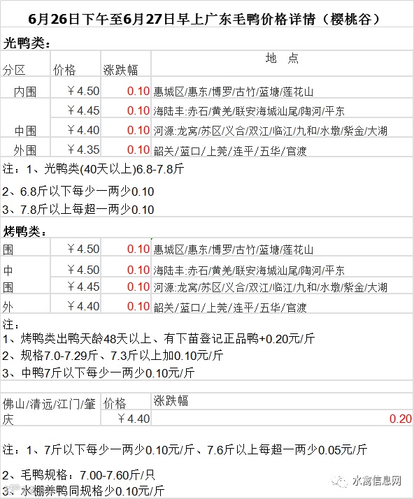 6月26日下午至27日上午毛鸭价格