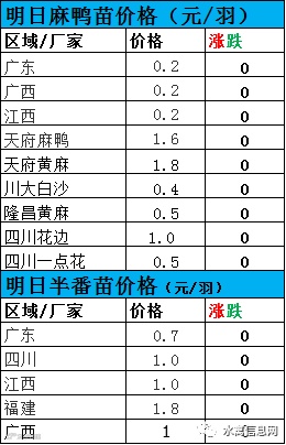 麻鸭苗继续躺着谷底报价稳定在0.2元/羽。半番鸭苗报价稳定。