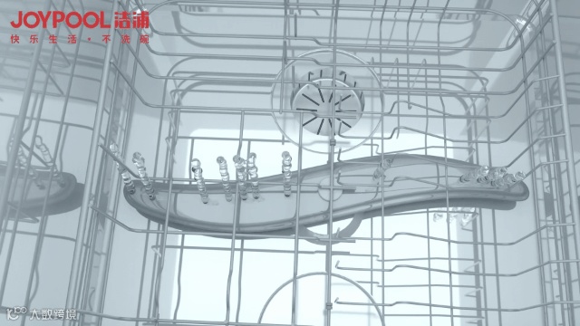 这些水柱在接触到洗碗机顶部后,受重力作用快速下行。在高温+高压的冲刷下,轻松去除顽固油污。
