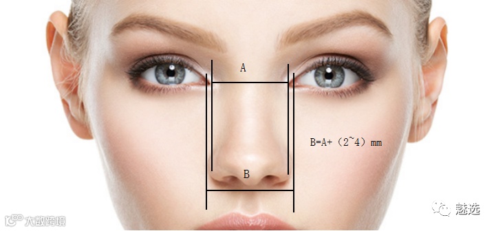 鼻下1/3的宽度,应分为两个方面,鼻翼基底宽度额鼻尖宽度。这部位的手术比较常见的是鼻翼缩小术。鼻翼基底的宽度一般应和内眦间距接近,但应略宽2~4mm。因为鼻翼的侧壁和鼻翼基底之间有转折,所以存在一定的外张,这部分就是超出内眦间距的部分。