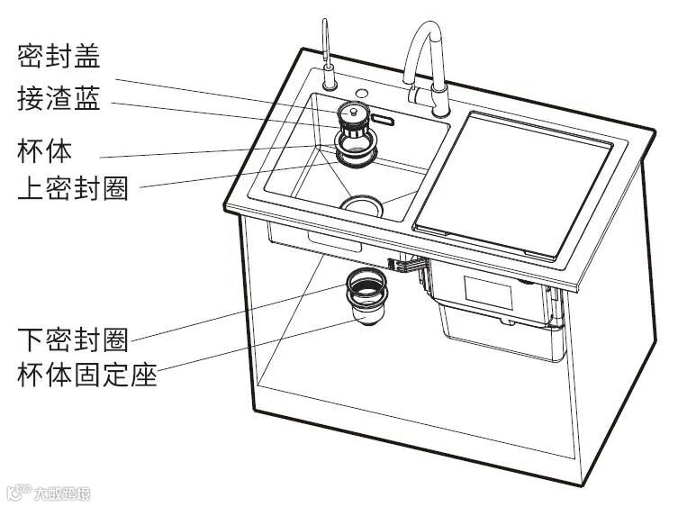 ②将主机从包装取出,先安装好主水龙头(主机不包含该配件),如有净水器龙头,皂液器可一并安装好,然后放入台面上方开孔中。