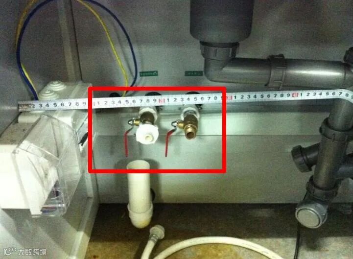 下图红色标记为右槽洗碗机的冷、热水管角阀预留位置。