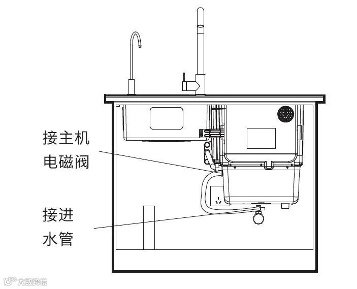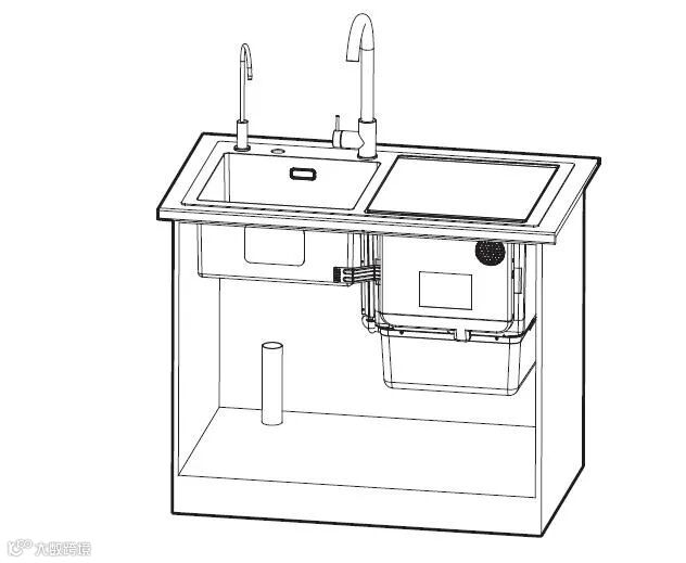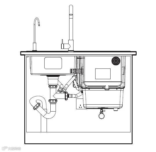 注:在选择洗碗机时,如果冷、热水管角阀、排水管以及电源插座位置在柜内左侧,则选择右槽洗碗机。反之,如果这三个的位置在柜内右侧,则选择左槽洗碗机(以下实例以右槽洗碗机为例)