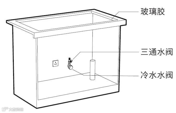 ①台面上开孔周围打一圈玻璃胶,将三通水阀接入墙体冷水水阀。