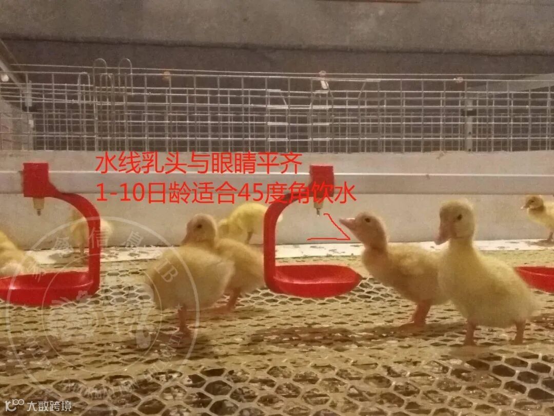 继续调整水线高度,使水线乳头基本与雏鸭眼睛高度一致,在1-10日龄一般鸭仰头45度角能喝到水就行。后期水线要高,仰角幅度要大。