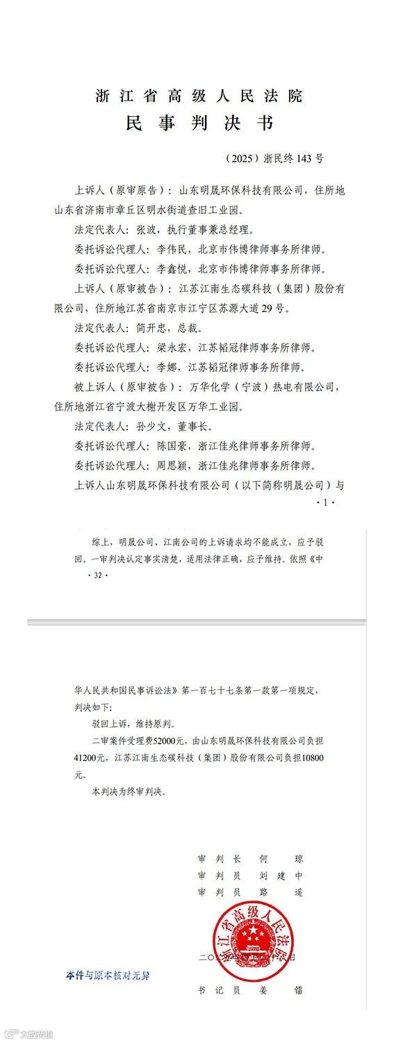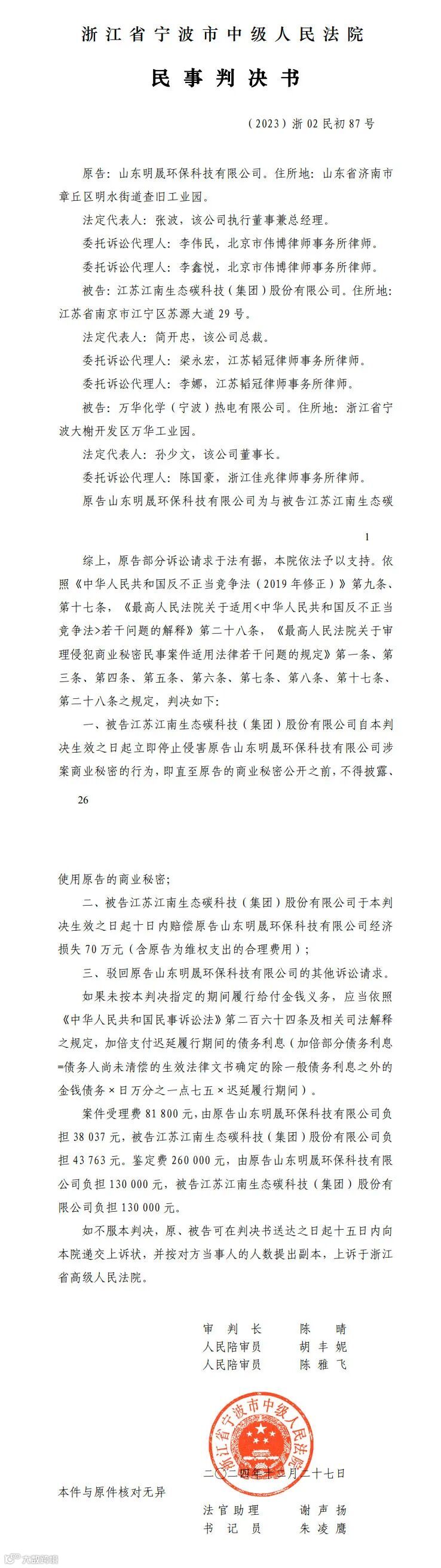 江苏江南生态碳科技(集团)股份有限公司(以下称江南公司)非法获取侵害山东明晟环保科技有限公司氨法脱硫技术商业秘密案,经宁波中院一审、浙江省高院二审,2025年4月28日浙江省高级人民法院终审判决,判决:“被告江苏江南生态碳科技(集团)股份有限公司自本判决生效之日起立即停止侵害原告山东明晟环保科技有限公司涉案商业秘密的行为,即直至原告的商业秘密公开之前,不得披露、使用原告的商业秘密。判决江南公司承担明晟公司经济损失70万元。 ”