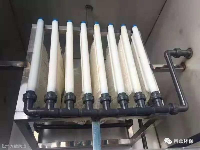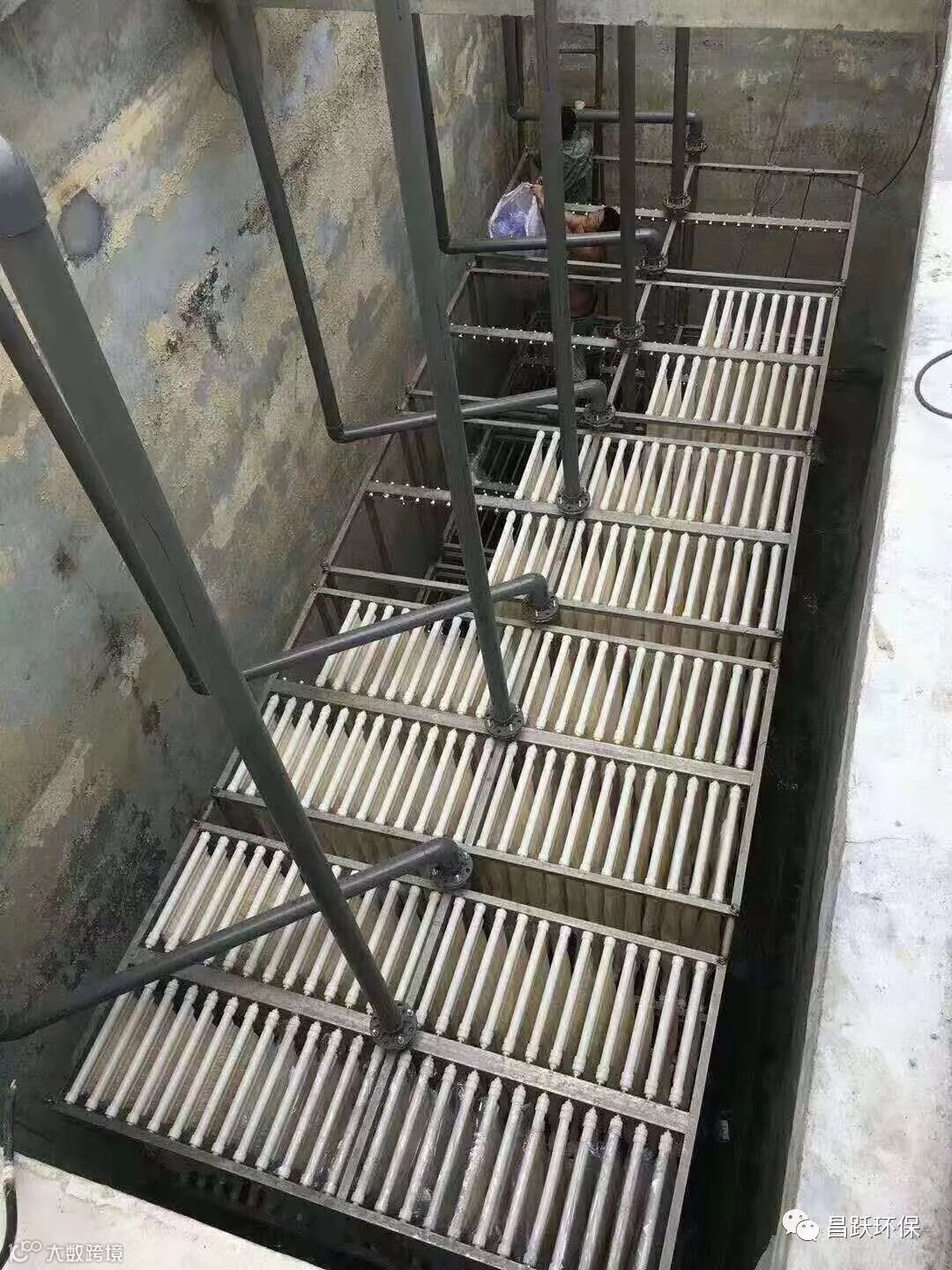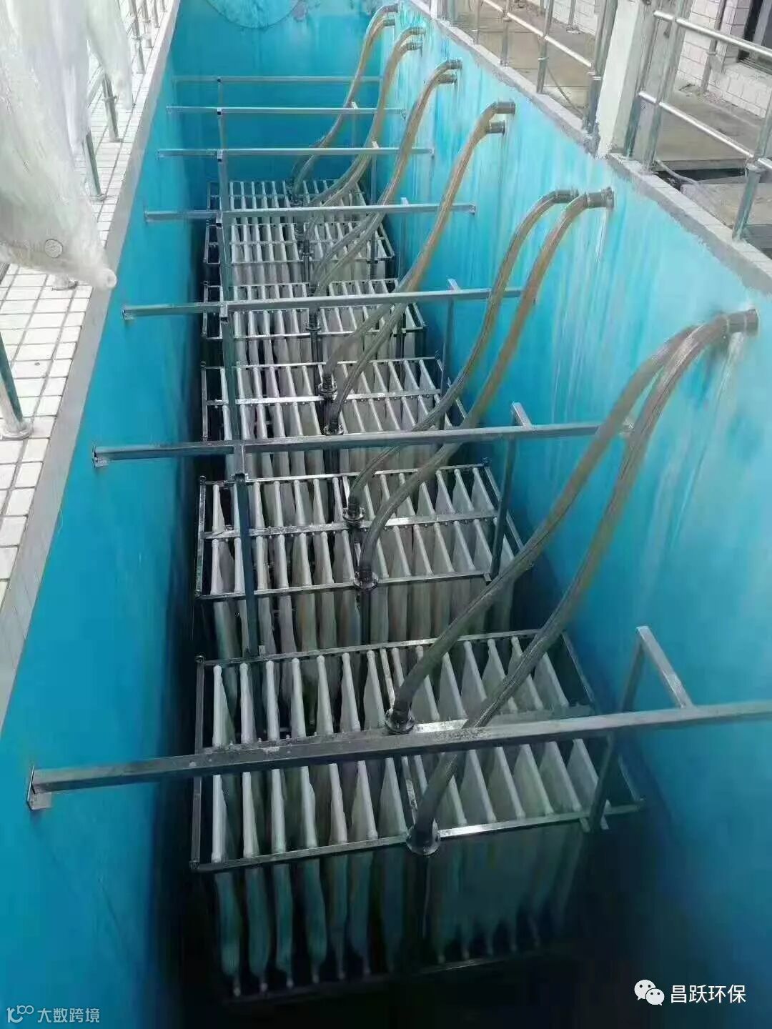 膜区中的MBR膜组件自身配置了空气曝气系统,用于提供生化所需的需氧以及用于抖动膜丝,减轻膜污染。处理后的泥水混合液在清水泵(或虹吸)的抽吸作用下,清水进入MBR中空纤维膜丝,再汇集于MBR集水管后由清水泵抽出,几乎全部细菌及悬浮物均被截留在好氧曝气池中,因此省去了二沉池,并使出水达到悬浮物接近于零的优良水质。